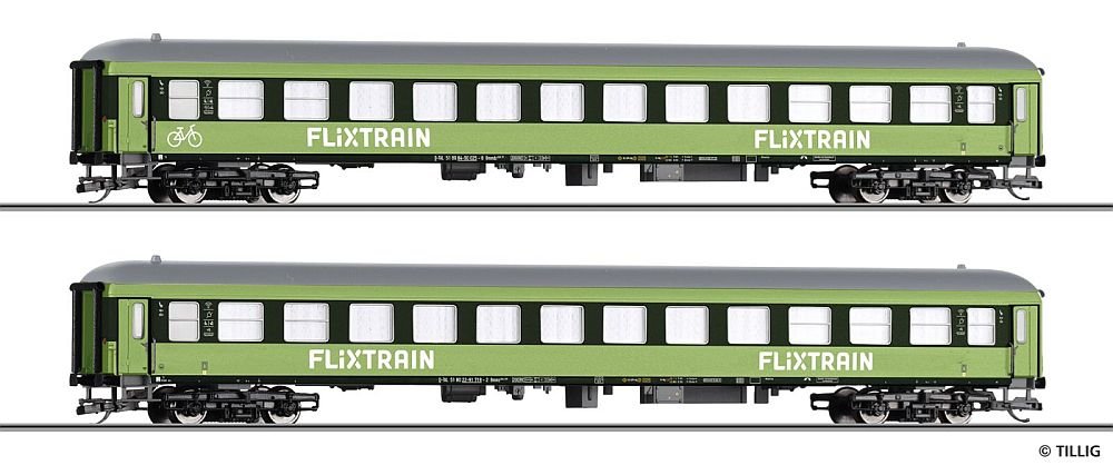 01101 Tillig TT Bahn - Souprava dvou rychlíkových vozů Bmmdz 268.7 a Bmmz 264.7 „Flix Train“