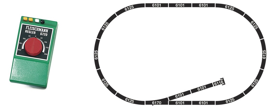 Regulovatelný transformátor, Fleischmann Profi-gleis (7 x 6101, 10 x 6125, 1 kolej s napájecím kabelem, 1 x výhybka 6170 a koncový blok 6116) Délka Vlaku: 310 mm Rozměr oválu: 148 cm x 88 cm