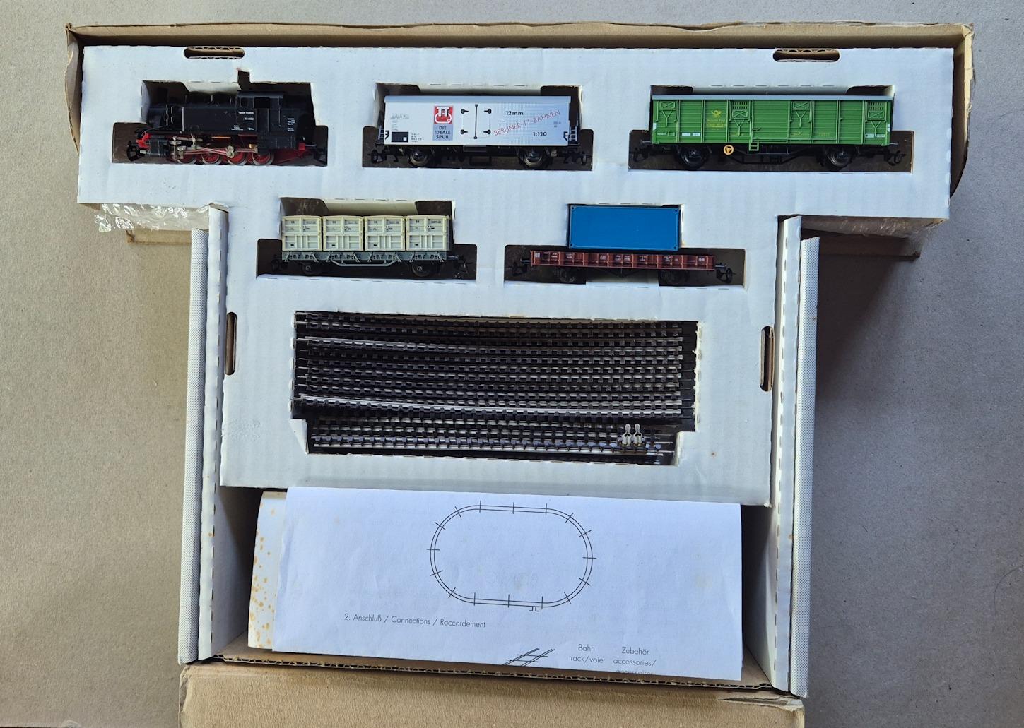 Nákladní set tvar TT s parní loko 92 nový hranatý moto, pulsní trafo koleje Tillig (TT). Set byl vyroben ve tvaru TT jako vývozní artikl, v setu je několik nákladních vagónů originál krabice.
