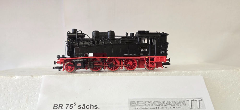 Parní lokomotiva řady BR 75.5 DR. jedná se o výrobek malosériové výroby tzn. model je velmi dobře propracován jedná se o ruční výrobu, velká část komponentů je z kovu,země původu je:Německo. Model je samozřejmě osvětlen.