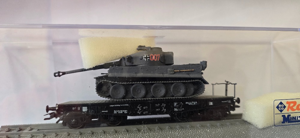 Plošinový vagón s nákladem bojové technicky doplňky přiloženy Roco (HO) originál obal
