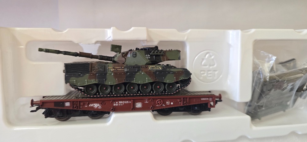 Plošinový vagón s nákladem bojové technicky doplňky přiloženy Roco (HO) originál obal