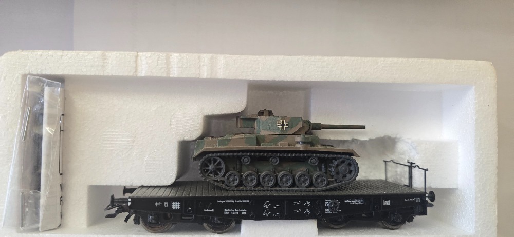 Plošinový vagón s nákladem bojové technicky doplňky přiloženy Roco (HO) originál obal