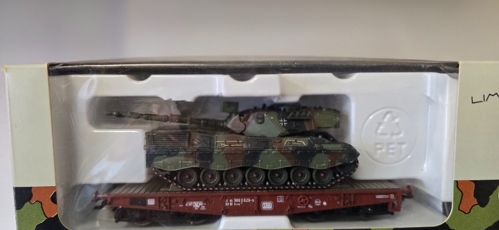 Plošinový vagón s nákladem bojové technicky doplňky přiloženy Roco (HO) originál obal